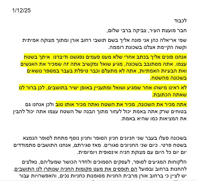 מתוך מכתב אותו קיבל צביקה ברבי מהתושבים בזמן הסיור בשכונת רוממה